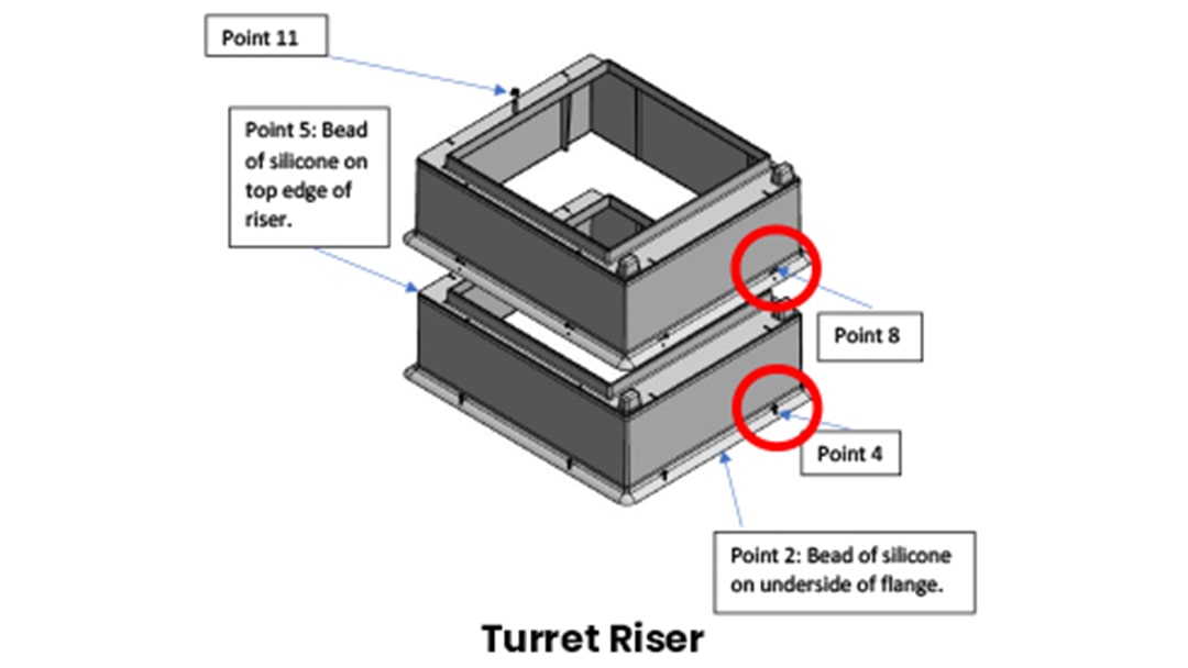 9. Apply a silicone bead on the riser inside to the riser joint. Make sure an excellent watertight seal is achieved.
